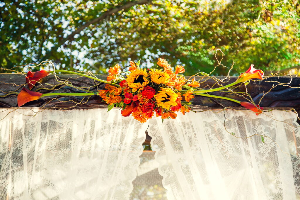 Herbstblumen wie Dahlien, Chrysanthemen oder Sonnenblumen passen perfekt. Warme Farben wie Orange, Rot und Gold dominieren die Dekoration und verleihen der Feier ein gemütliches Ambiente.